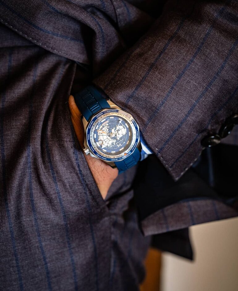 The limited edition GMT Globetrotter in blue is a dedication to the Italian explorer Giovanni Caboto , who made an enormous contribution to the discovery of uncharted lands and waters, colonizing North America.