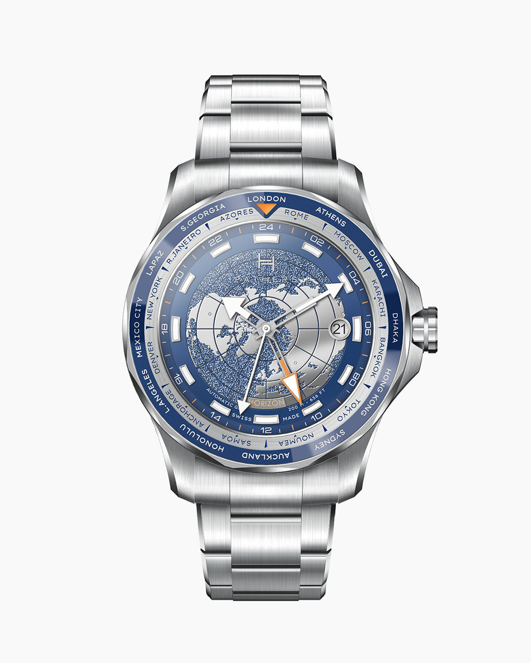Fathers “Globetrotter Blue” automatic GMT watch with ETA 2893 movement, 316L steel case Ø 40 mm with anti-scratch treatment.